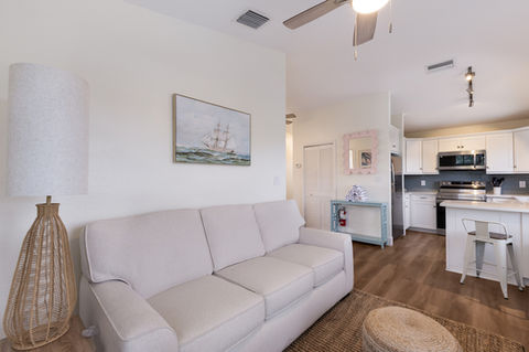 Step inside to find a bright, open living space with coastal décor, a fully equipped kitchen for easy meals, and a comfortable living room for movie nights after a day in the sun. Each bedroom features soft bedding and plenty of storage, and the updated bathroom is stocked with fresh towels and beach essentials.