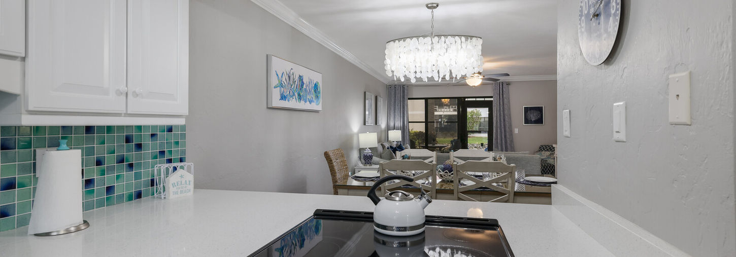 This condo offers a contemporary retreat with stylish furnishings, a fully equipped kitchen, and cozy bedrooms. Unwind in the living area or step out onto the private screened lanai for a breath of fresh sea air. Walk into a world of contemporary design and tasteful finishes. This condo boasts a seamless blend of style and functionality, offering a tranquil retreat from the everyday hustle. With sunset views directly across the street from your unit. This condo features a spacious and completely stocked kitchen with stainless steel appliances, perfect for creating masterpieces or hosting gatherings with ease. Unwind in spacious bedrooms designed for comfort and relaxation. The master suite is a sanctuary of its own, with a King bed and plenty of storage.